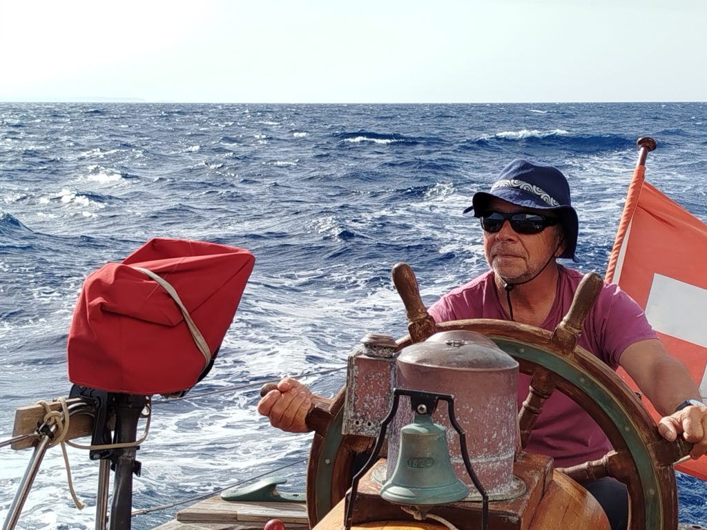 Je possède actuellement un canot voile – avirons que j’ai construit moi-même. J’ai navigué plus de 10000 miles en Bretagne, en Ecosse et sur l’océan Pacifique, comme équipier sur différents voiliers et sur Helena.